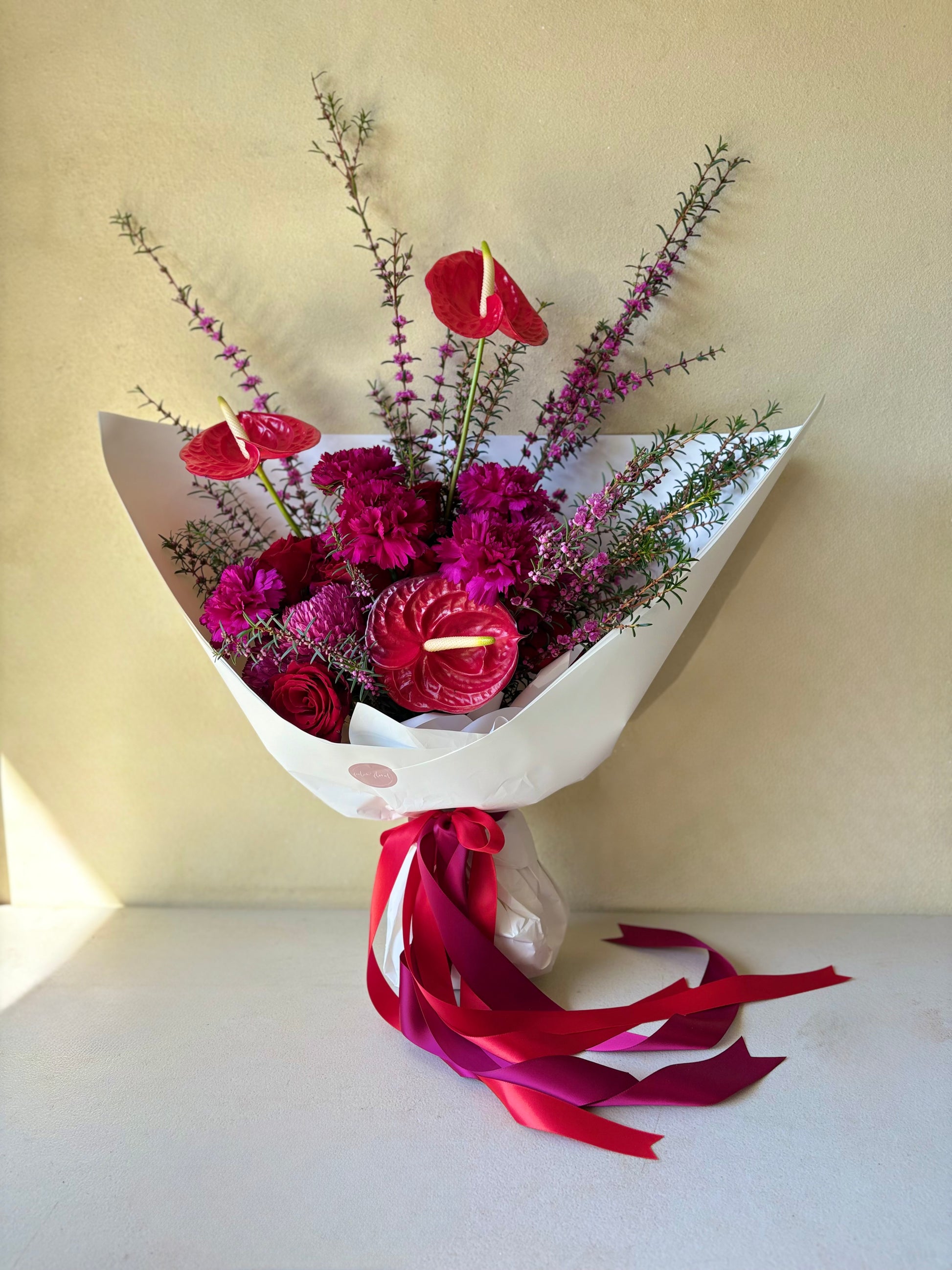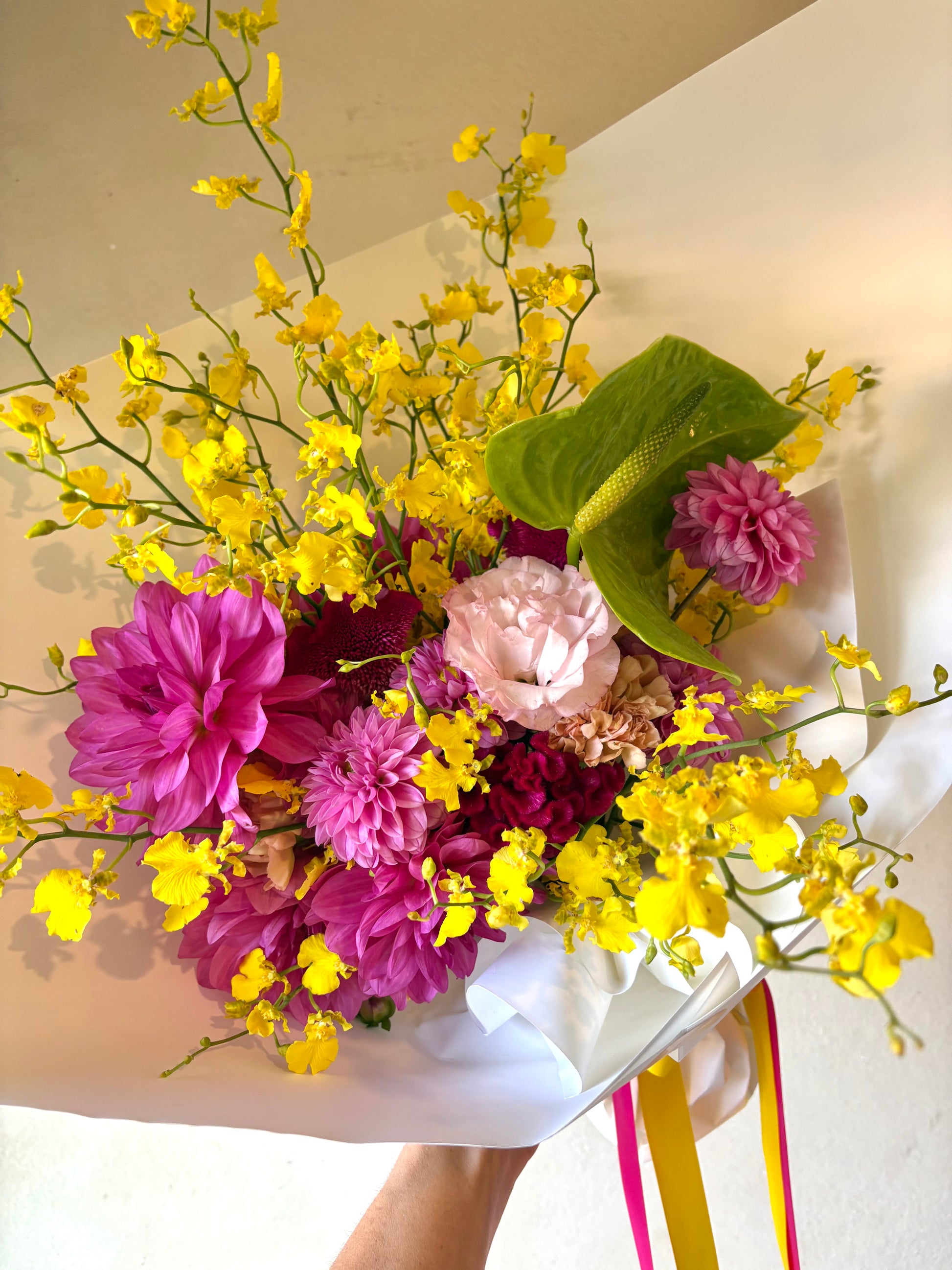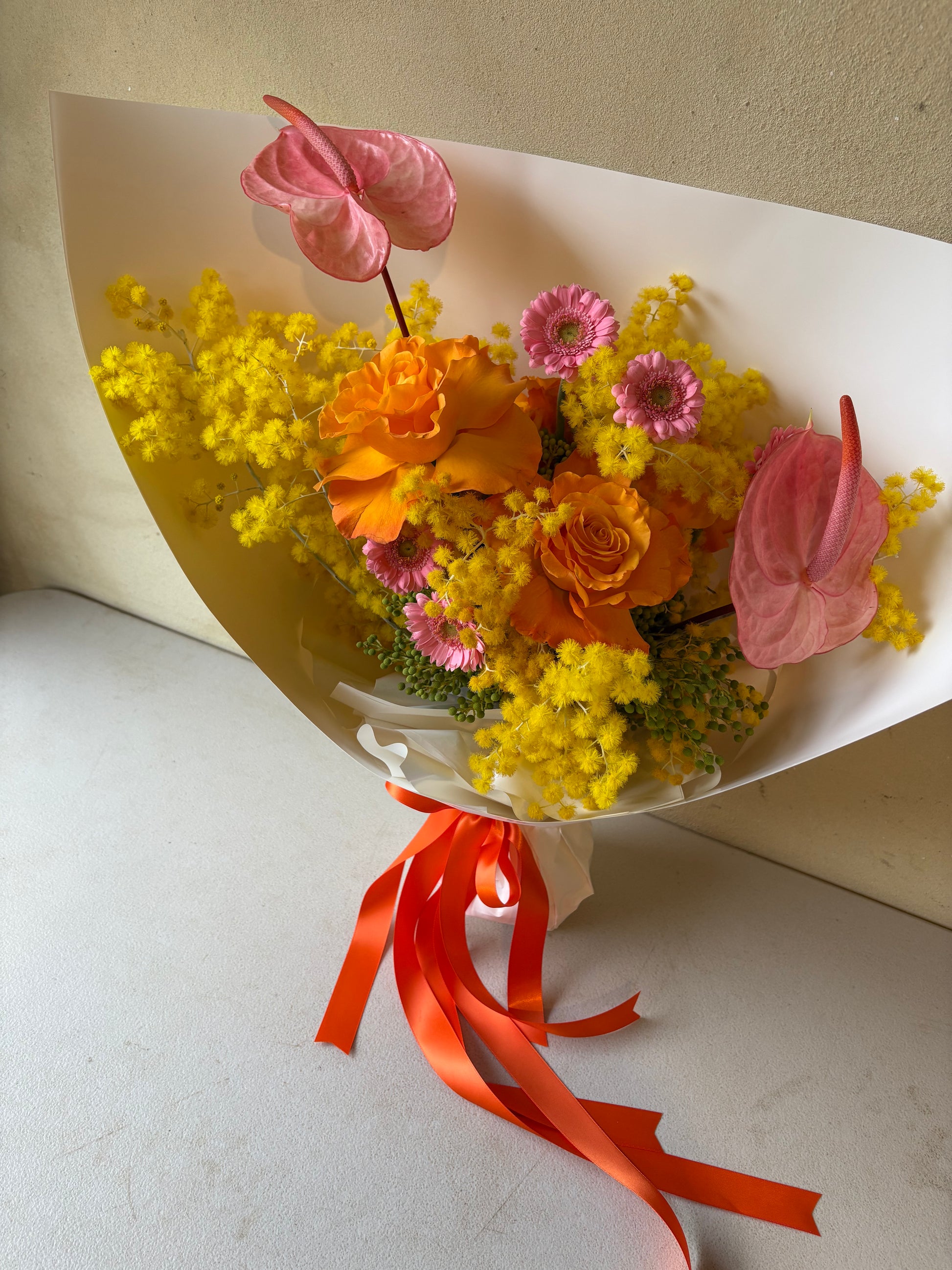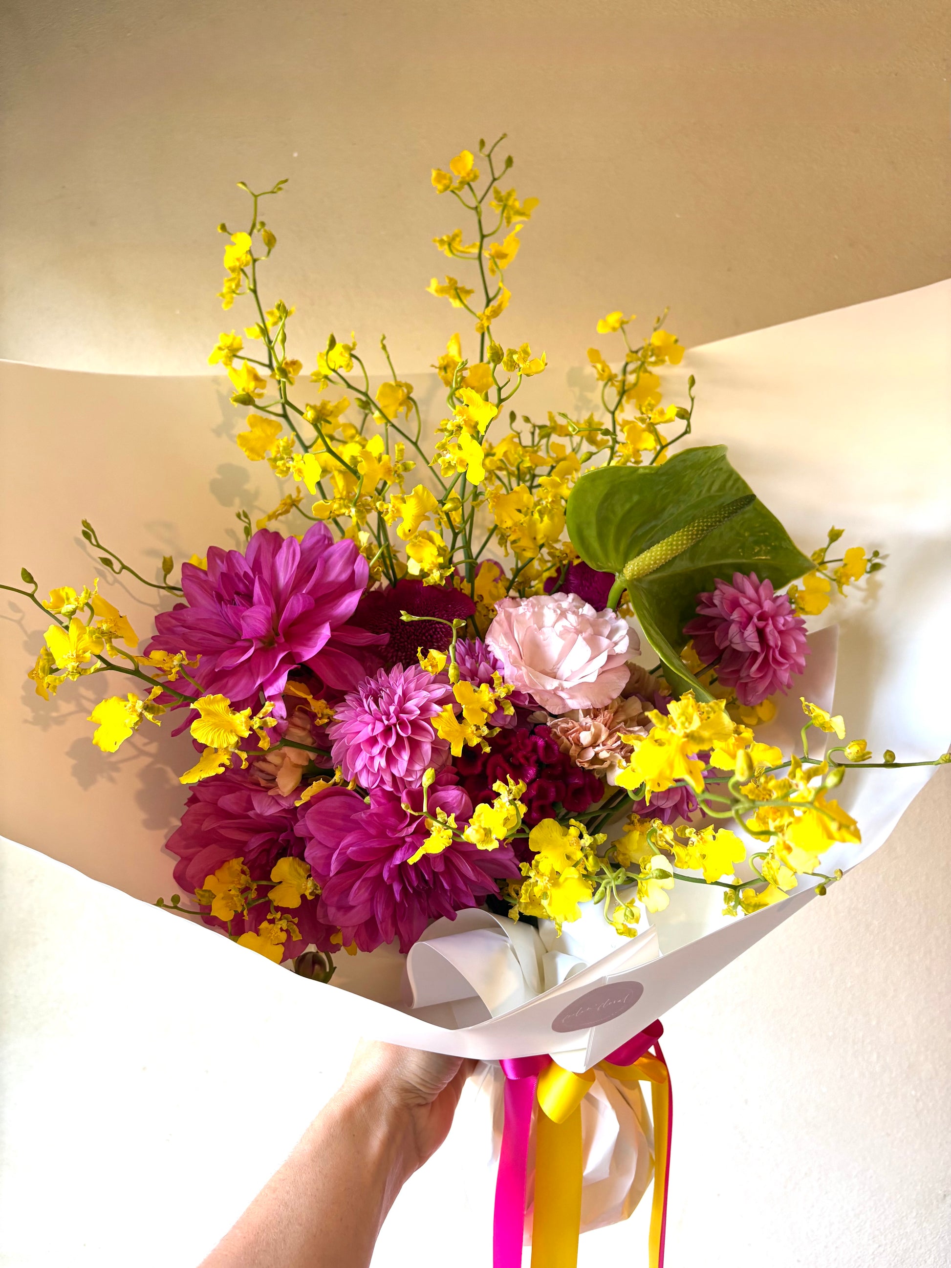 a selection of fresh, seasonal blooms in bright and bold colour tones, bouquet wrapped or arranged in vase with complimenting ribbon and handwritten greeting card.